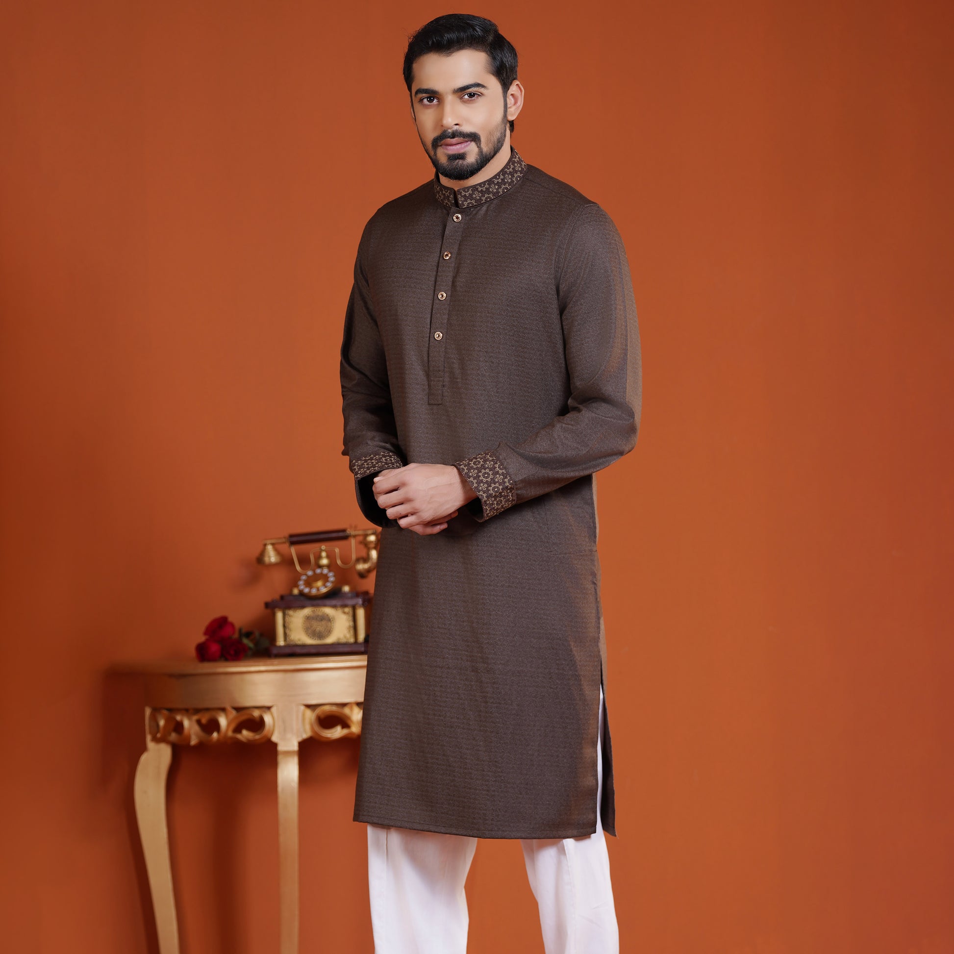 A statement of timeless elegance, the Imperial Panjabi – Dark Brown is built from High Grade Suiting fabric (GSM 200) for superior quality. Featuring an embroidered collar and cuffs, paired with the exclusive Signature Button, this regular fit Panjabi blends heritage craftsmanship with modern sophistication, making it a wardrobe essential.