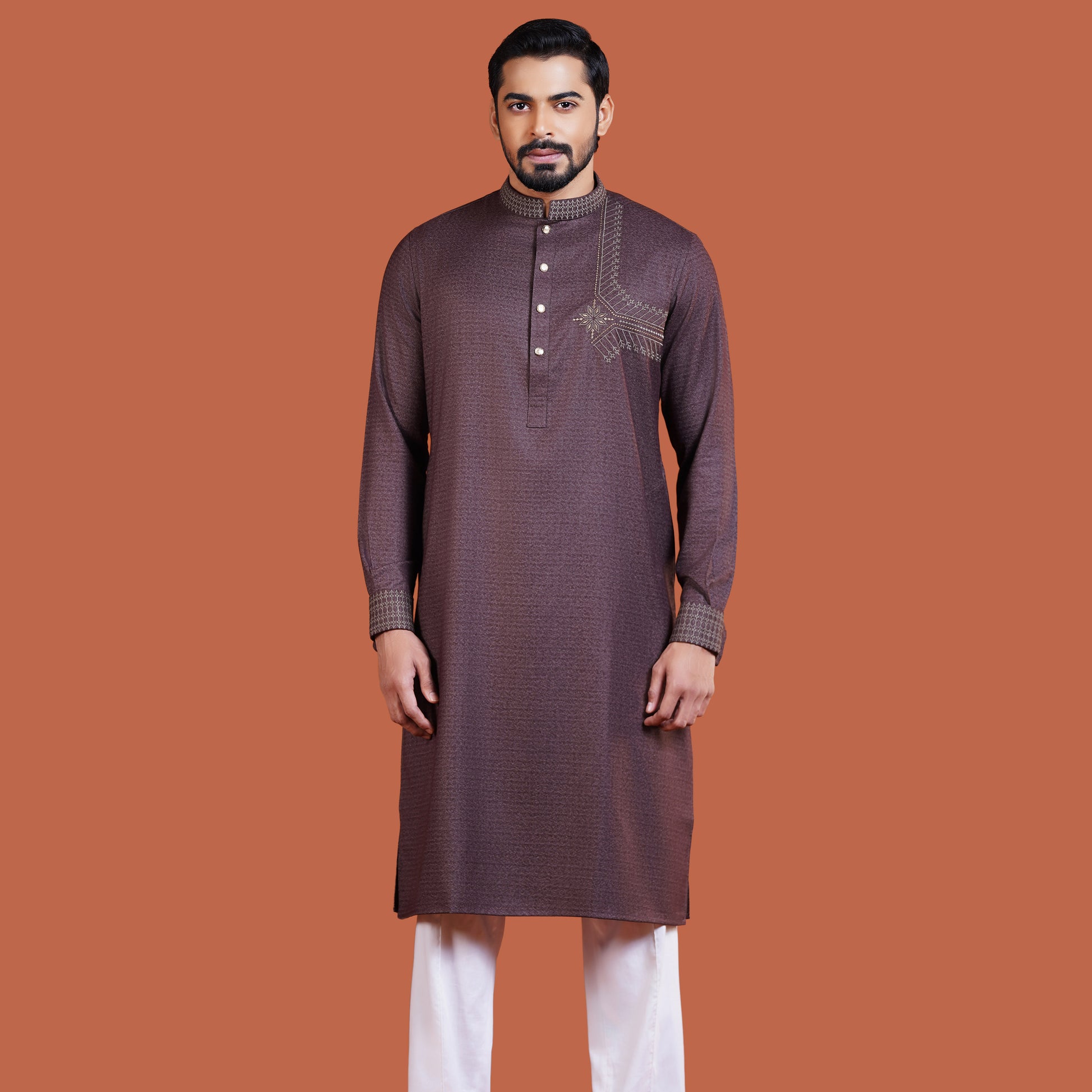 Experience premium craftsmanship with YAMAAN’s Imperial Panjabi – Dark Chocolate. Built from 100% High Grade Suiting fabric (GSM 200), it delivers both structure and comfort. The embroidered collar, double cuffs, and front chest embroidery highlight meticulous artistry, complemented by the distinguished Signature Button. Designed in a regular fit, this Panjabi is the perfect blend of tradition and modern sophistication.