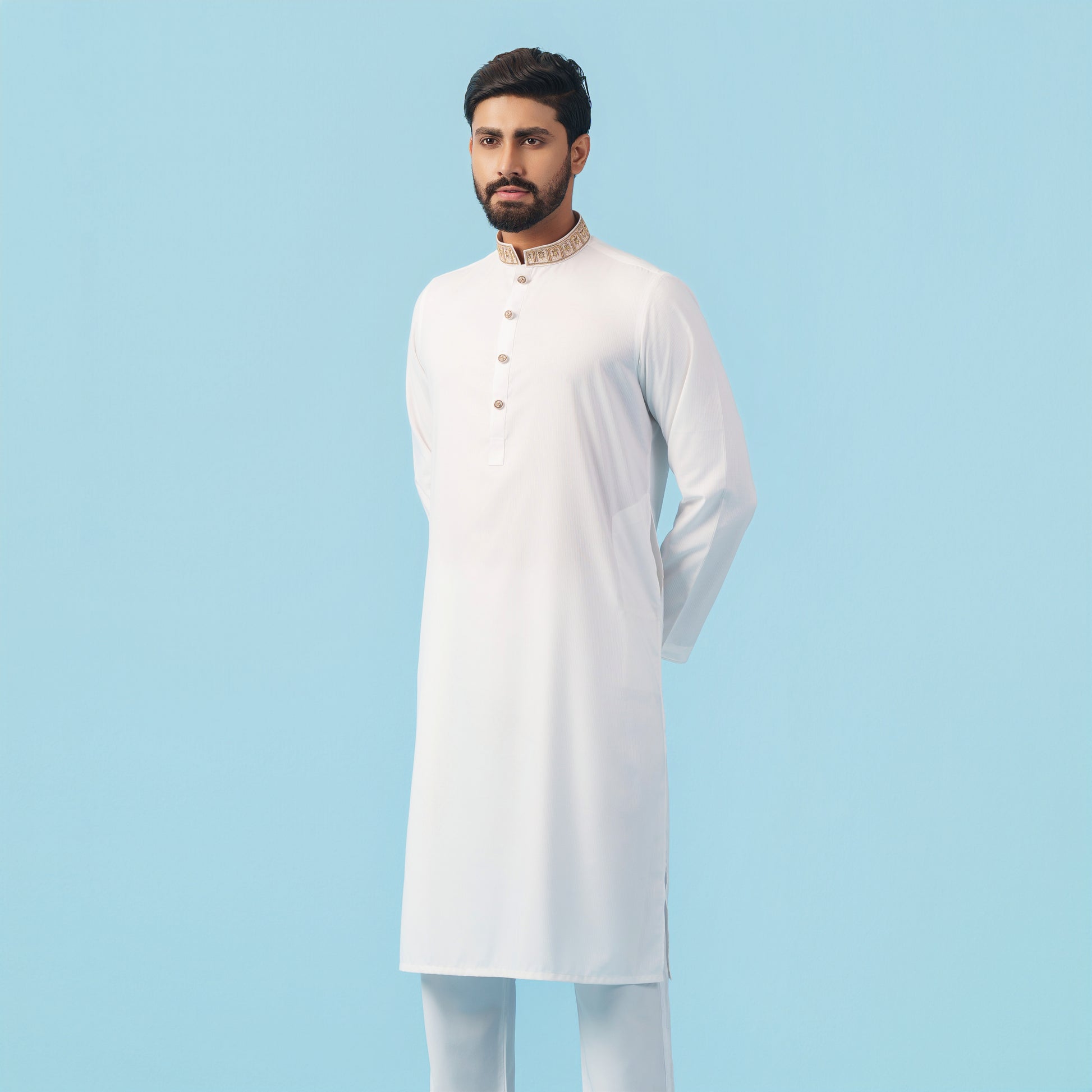 Made from 100% ultra-fine cotton (GSM 125), it offers a breathable, structured, and premium feel. Designed in a regular fit, it is ideal for Eid, weddings, and refined cultural occasions.