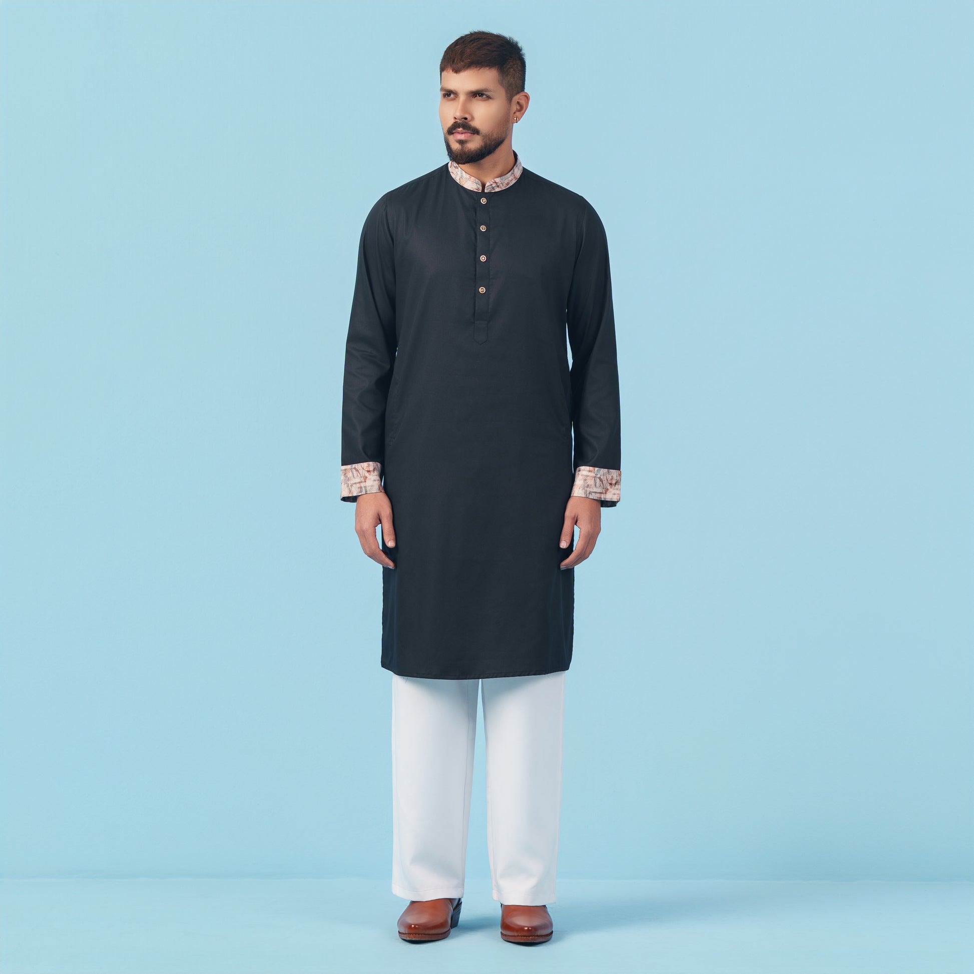 Command attention with YAMAAN’s Royal Panjabi in classic Black, tailored from 100% fine cotton for a smooth, breathable finish. The abstract contrast fabric on the collar and sleeves adds a bold yet refined edge, while the Signature Button reflects YAMAAN’s hallmark of sophistication.