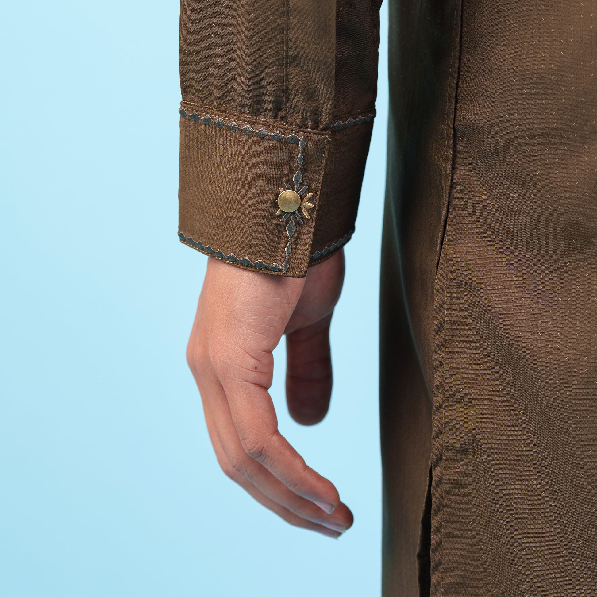 A bold yet graceful choice, the Dark Brown Signature Panjabi blends heritage artistry with modern tailoring. Embroidery enriches the collar, cuffs, and chest, while cotton jacquard fabric (GSM 130) delivers breathable comfort.