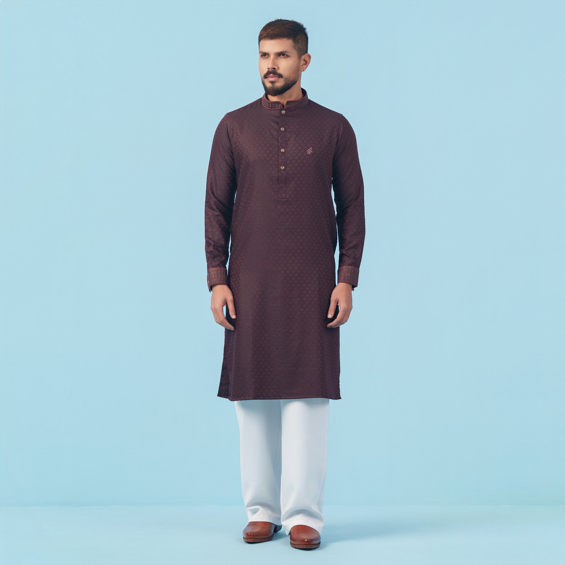 Designed for moments of grandeur, the Dark Maroon Signature Panjabi features contrasted embroidery across the collar and cuffs.