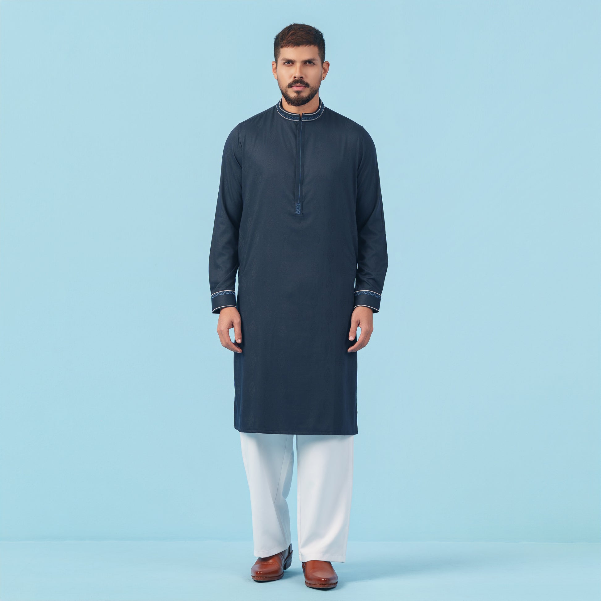 A timeless shade with modern appeal, the Dark Navy Signature Panjabi blends heritage artistry with contemporary tailoring. Embroidery enriches the collar and cuffs, while cotton jacquard fabric (GSM 160) delivers breathable comfort.