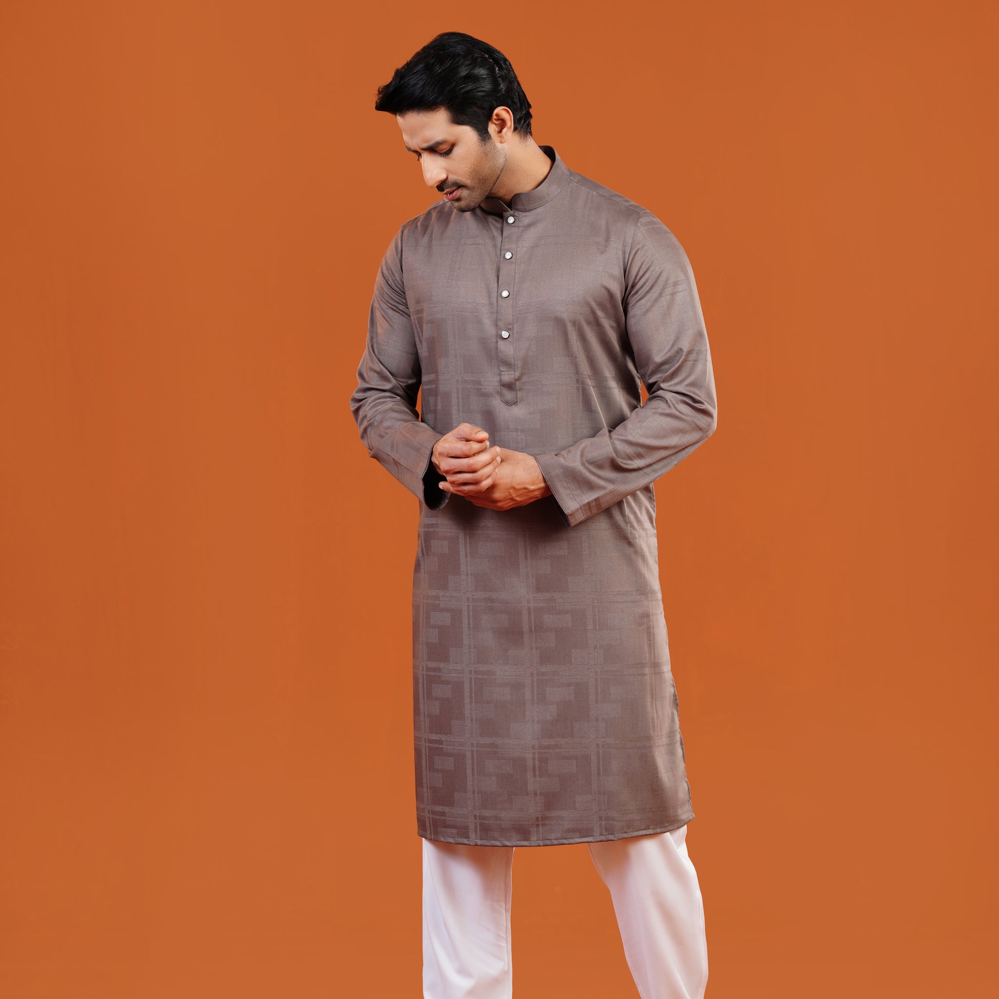 A versatile grey shade brings modern refinement to this Royal Panjabi. The collar and cuffs are detailed with piping for subtle distinction, while the signature button adds exclusivity. Bamboo cotton fabric ensures softness and breathability, with GSM 160 providing structure. The regular fit silhouette offers comfort and elegance for festive occasions.